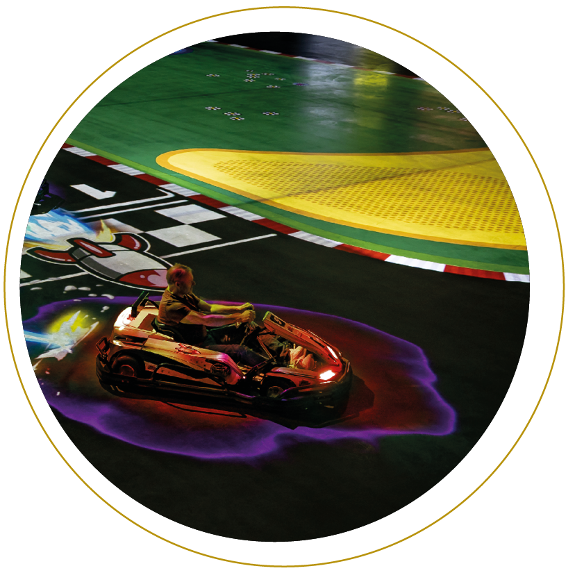 Drive the e-kart through spectacular virtual worlds. Like Mario or Luigi®, you can race with your friends on various tracks. Slow down your opponents with fun interactive elements that you collect from time to time on the track. Use the turbo, fire a rocket or put a nasty oil drum in your opponent’s way to win the race.