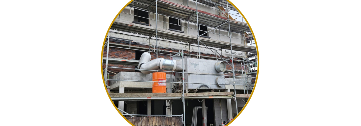 Wer in den letzten vier Wochen auf dem Bau war, wird unsere monströse Heizung aus der alten Festhalle am Bau brummen gehört haben. Diese brummt jetzt leider nicht mehr, da sie ihren Einsatz nicht überlebt hat. Zuverlässig hat sie alles getrocknet, bis sie gestern wieder in die Festhalle verladen werden sollte und dabei leider vom Radlader gekippt ist. Wie sehr wir uns geärgert haben, müssen wir glaube ich nicht erwähnen. Wenigstens hat sie vorher noch alle relevanten Arbeiten erledigen können. Sehen wir es mal positiv.
